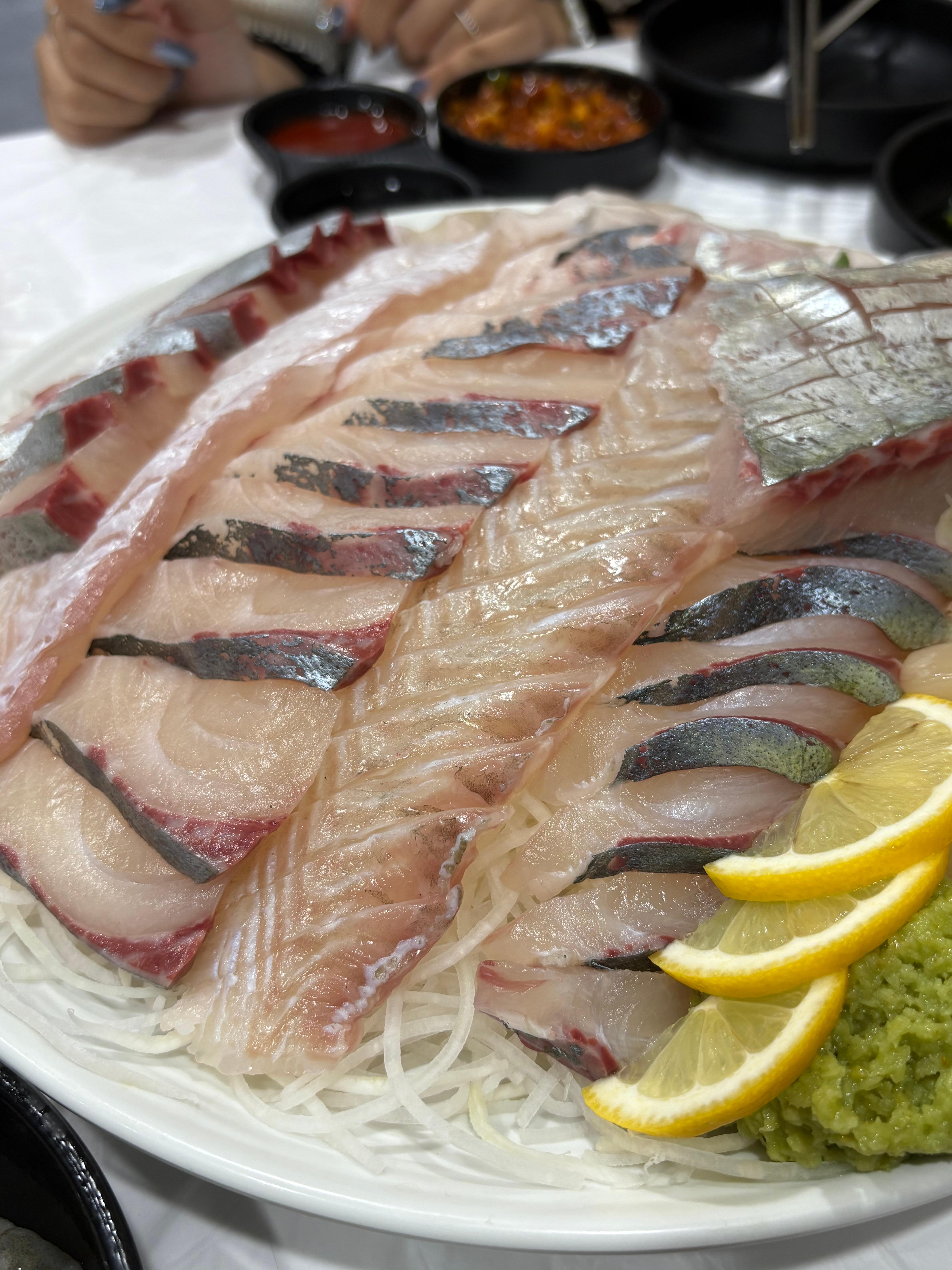 “7명이요~ 광어 한 마리랑 전갱이 어때요?” 사장님이 추천해주셨는데, 전갱이는 제철이라며 강력 추천!