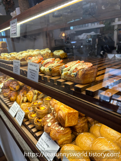 케이크 픽업만 하고 돌아올 수 없죠 😆 진열된 빵들이 하나같이 너무 맛있어 보여서 결국 몇 가지를 담아왔어요.