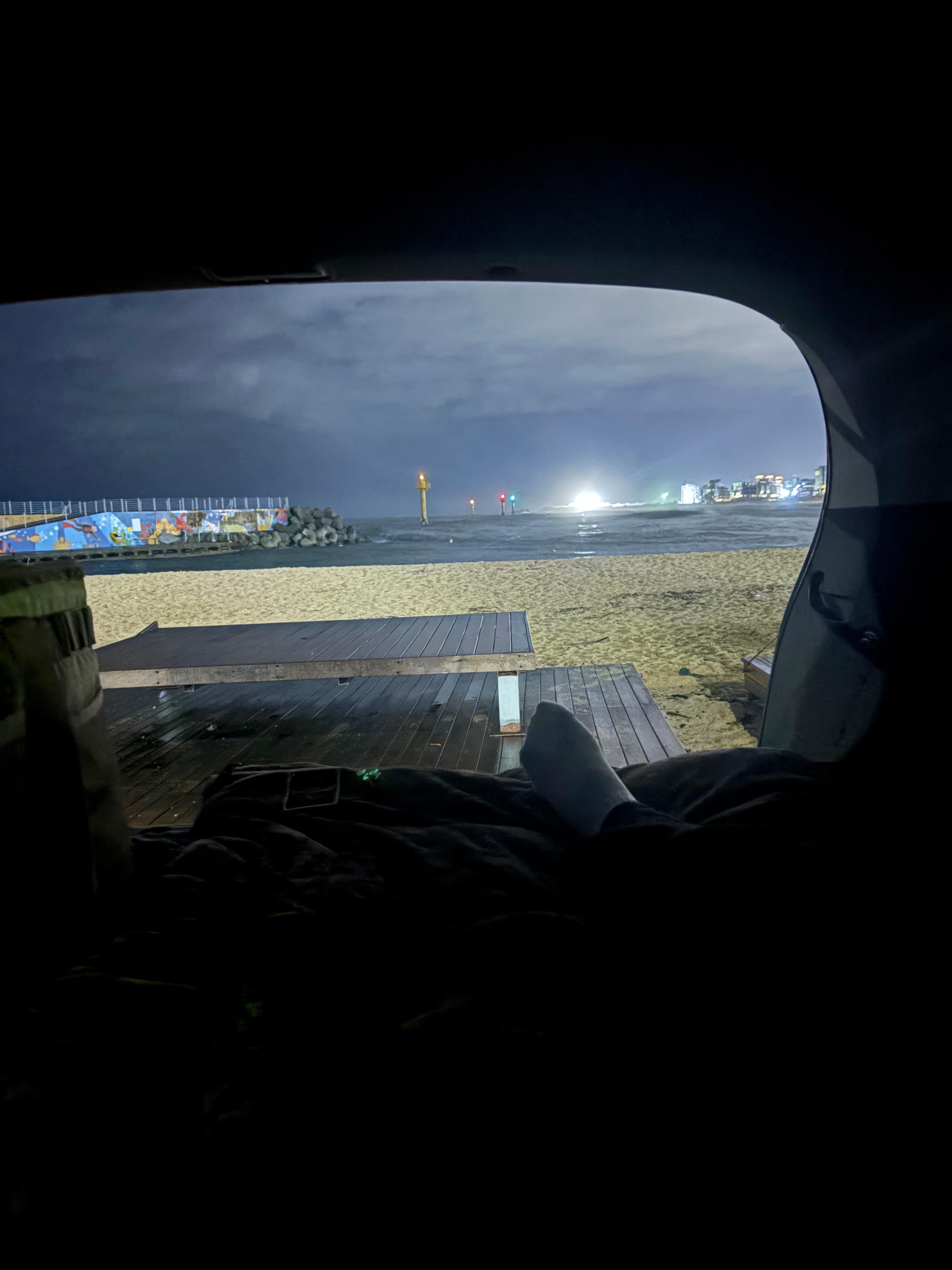 밤이 깊어지자 각자의 차 안으로 들어가 파도소리를 자장가 삼아 잠들었어요 🌙