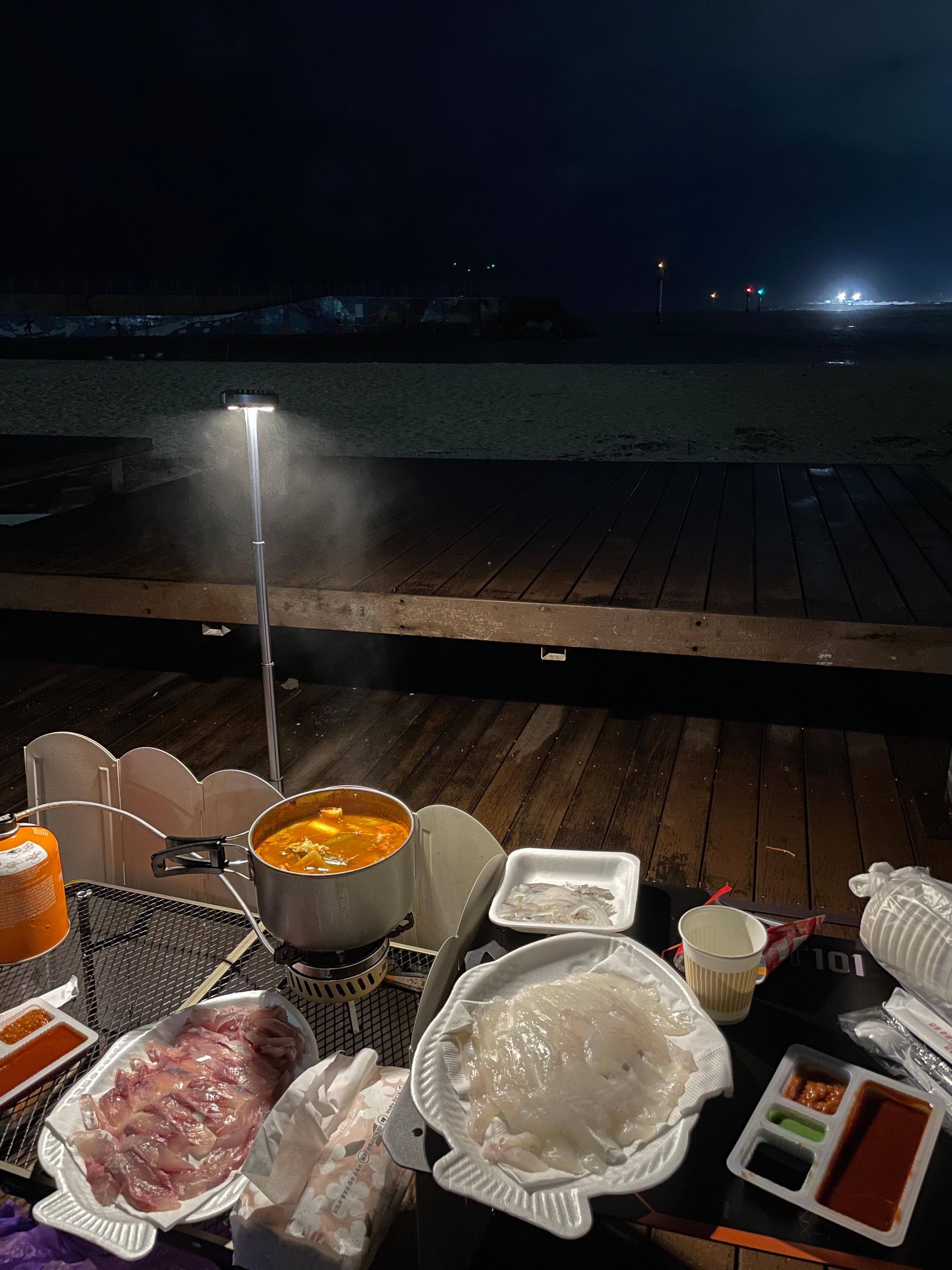 차박의 하이라이트는 뭐니 뭐니 해도 먹거리 🍴 근처 회센터에서 싱싱한 회를 떠와서 바다 앞 테이블 위에 펼쳐놓았어요.