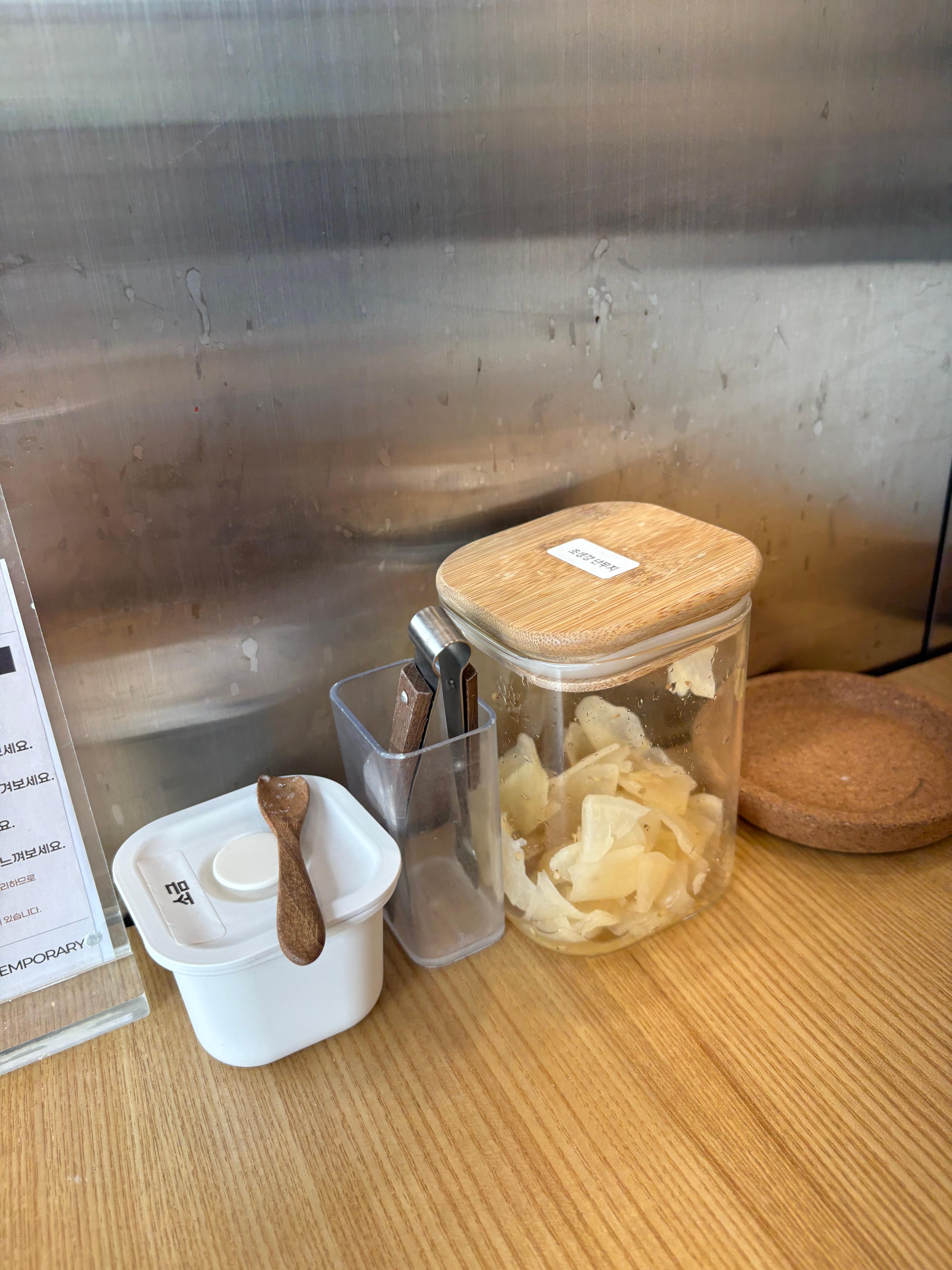 내부는 모던하고 조용한 분위기라 혼밥도 부담 없고, 테이블엔 기본 구성(물컵·생강절임·소금)이 깔끔하게 세팅되어 있어요.