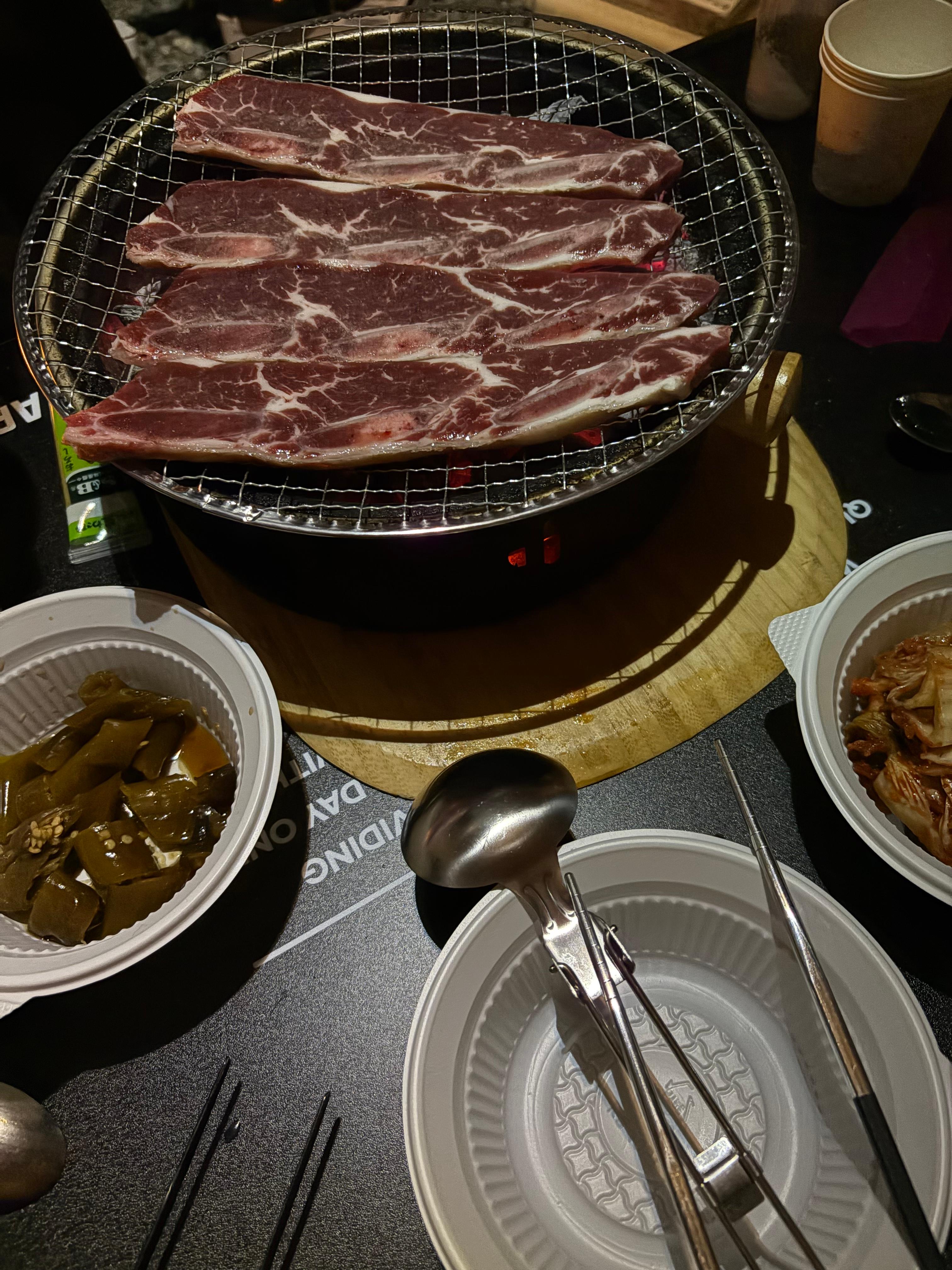 차 세우고 바로 세팅 → 숯 올리고 → LA갈비 굽기 START! 불향 가득한 LA갈비는 진짜 캠핑장에서 먹을 때 더 맛있어요.